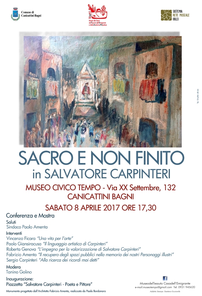 Conferenza, mostra e inaugurazione “Piazzetta Salvatore Carpinteri – Poeta e Pittore” - Sabato 8 Aprile 2017 ore 17,30 - Museo TEMPO via XX Settembre 132 – via De Pretis 18 a Canicattini Bagni